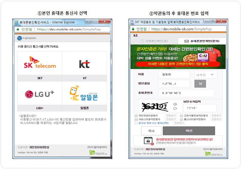 4. 휴대폰 개통시 등록된 정보(이름, 성별, 생년월일, 휴대폰 번호)와 ③번에 입력한 정보를 비교하여 본인 확인 후 등록된 휴대폰 번호로 인증번호 전송