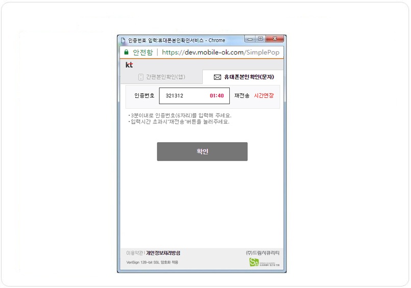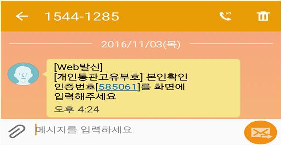 5. 휴대폰으로 전송된 인증번호를 확인하여 인증번호 입력창에 입력하고 ‘확인’ 버튼 선택
