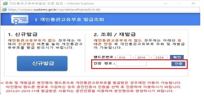 2. (공통) 개인통관고유부호를 처음 발급 사용자는 신규발급 버튼을 선택, 기 발급 사용자는 조회/재발급에서 핸드폰번호 입력 후 ‘확인’ 버튼 선택