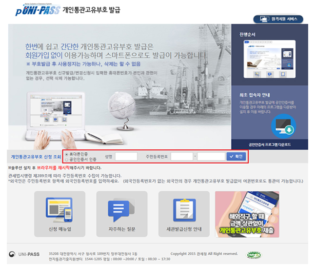 2. (공통) 개인통관고유부호를 처음 발급 사용자는 신규발급 버튼을 선택, 기 발급 사용자는 조회/재발급에서 핸드폰번호 입력 후 ‘확인’ 버튼 선택