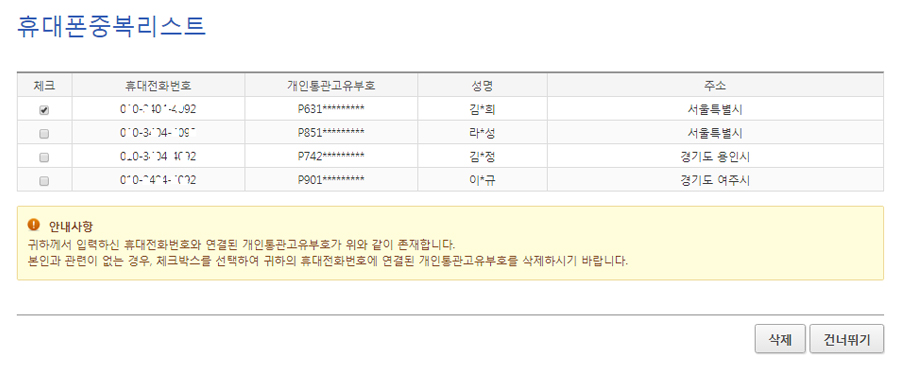 7. 통관고유부호등록시 입력한 휴대폰번호와 연결된 다른 개인통관고유부호부호의 전화번호를 선택삭제
