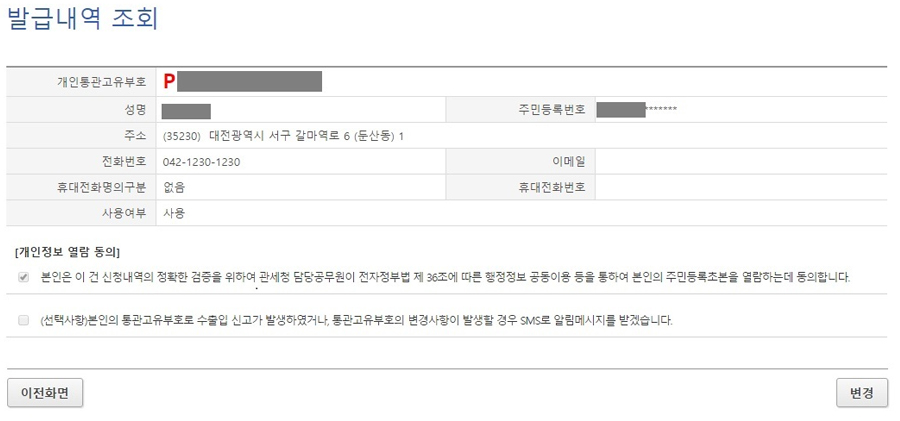 8. 4번을 등록하면 신청정보가 DB에 저장된 후, 개인통관고유부호 발급 시스템에서 개인통관고유부호를 자동 발급